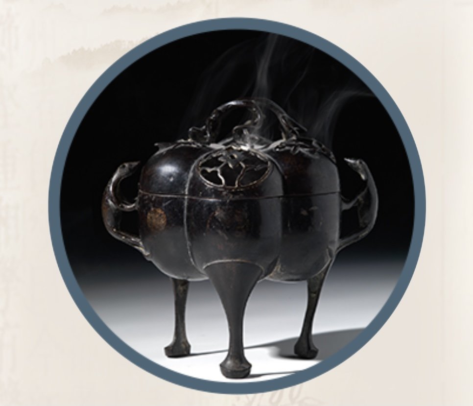 | 【明代铜熏炉】 明代瓜棱形兽耳铜熏炉造型奇特,呈瓜棱形,侧面镶有一对兽耳,以此可以看出古人对美学的要求极高。熏炉一般是用来焚烧熏香以达到改善环境的目的,正如李清照词中所写”瑞脑消金兽“,而“金兽”就是指此类熏炉。 |