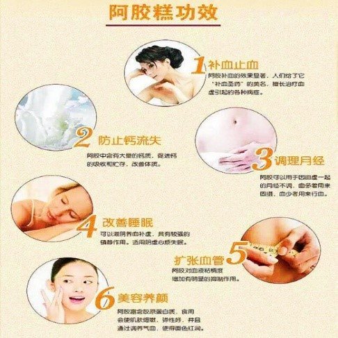 阿胶之所以补血,是因为它含有多种蛋白、钙、氨基酸等成分,能有效促进血红细胞与铁元素的合成,并能改善血钙的平衡,从而促进造血功能,缓解贫血的症状。功效大致总结为补血,滋阴,润肺和止血。顾名思义,血虚诸证、出血、肺阴虚燥咳、心烦失眠,以及西医诊为贫血属肝血亏虚者,功能性子宫出血、慢性胃肠道出血、痔疮出血、支气管扩张属血虚出血、肺结核、肾结核、甲状腺功能亢进、更年期综合征等属阴虚燥热者,都可以按医嘱服用阿胶。