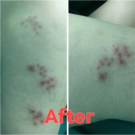 3)服用中药调理。水泡减轻,不再有灼烧感。肤色恢复正常,疼痛部位仅稍有麻木感。但患者重返工作岗位,由于工作压力太大,导致手臂麻木,反复发作刺痛,经诊断发现舌质暗红,苔白腻,脉沉细。后又服用中药调理,通络止痛。之后,痂开始脱落,减轻疼痛和麻木无明显症状。