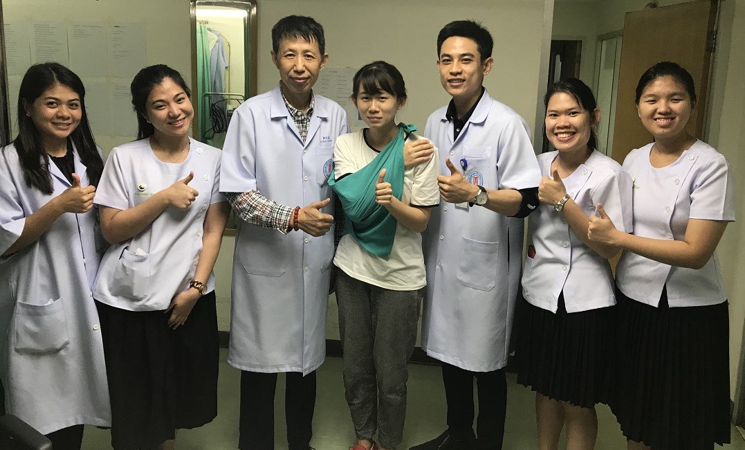 看到小宋疼的流眼泪,按摩店的工作人员立即找来会讲中文的工作人员,帮忙冰敷加固定手臂,由于是深夜,就诊不方便,于是忍者剧痛度过了一整晚,天一亮立马打出租车奔向华侨中医院。到医院后,顺利地挂号,15分钟后见到了骨科的李汉成中医师。仔细检查后,在医生的安排下,马上拍X光片,李老师确定病人是脱臼,还没等小宋反应过来,只见李老师托起病人手臂,“咔“的一声,在完全不痛的情况下,胳膊能正常活动了。太神奇了,小宋感动地落泪,感谢李老师的治疗,感叹中医治疗骨伤的神奇。