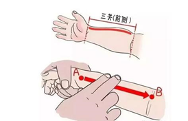 按摩方法:使用按摩器的食指和中指。从手腕横纹推向上肘横纹。推 5-10 分钟直到按摩部位感到温暖。