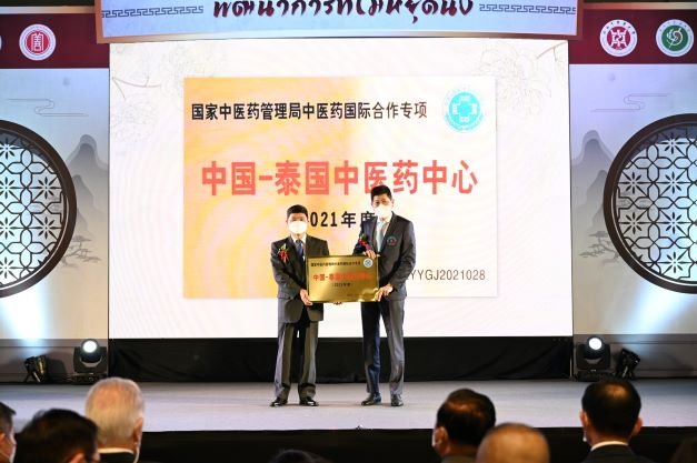 中国驻泰王国侨务参赞刘敬师代颁了2021年度“中国-泰国中医药中心”的立项牌