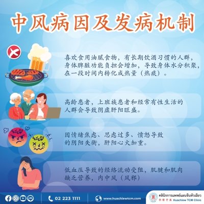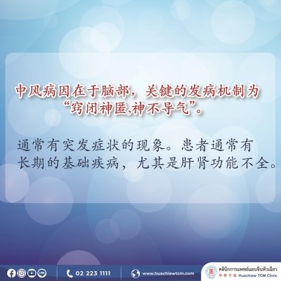 据中医所知,中风病因在于脑部,关键的发病机制为“窍闭神匿,神不导气”。通常有突发症状的现象。患者通常有长期的基础疾病,尤其是肝肾功能不全。