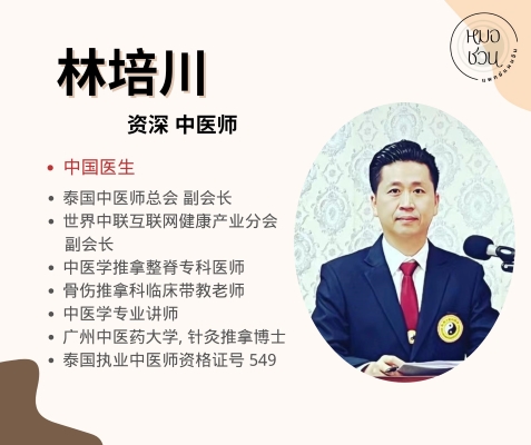 泰国华侨中医院骨伤推拿科林培川资深中医师,广州中医药大学针灸推拿博士研究生。出生于广东潮州中医世家,因从小耳濡目染,立下学医的志向,望在日后成为一名响当当的名中医。现任泰国中医师总会副会长,世界中联互联网健康产业分会副会长,从事骨科推拿15年,是泰国中医执业管理委员会唯一入选认证的“中医学推拿整脊专科医师”,家族林氏推拿整脊疗法的传承人。