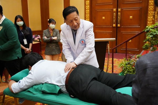 目前泰国人口呈老龄化趋势,随着泰国进入老龄化社会,老年痴呆的发病率也逐年攀高,发病人群遍布也越来越广泛。讲座中,李宗民教授指出,老年痴呆症是一种中枢神经系统疾病,主要表现为渐进性记忆障碍、认知功能障碍、语言障碍等神经症状,导致患者逐渐丧失生活自理能力,对家庭造成不可磨灭的影响。根据李宗民教授60年长期临床经验证明,老年痴呆发病病机多为肾精亏虚,脑退化是人类不可抗拒的自然规律,但勤用脑、重饮食、多运动是可以延缓脑退化,预防老年痴呆症的主要方法。讲座上,李宗民教授亲自演示中医治疗手法,通过按摩手法刺激经络,治疗和预防老年痴呆症。