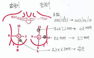 2023年4月10日再次复查B超显示双侧乳腺纤维瘤减小,左上内侧12点囊肿目前为4.5mm(之前为 8.6x7.2mm),左侧3点囊肿目前为3.7mm(之前为8mm),右侧5点囊肿消失(之前为 6.3x6.1mm)。