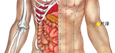 此穴位于肘横纹中,当肱二头肌腱的尺侧缘。