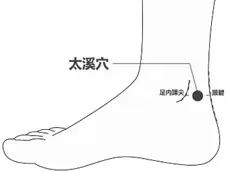 1. 太溪:内侧脚踝尖与脚后背筋(阿基里斯腱)的中间处。