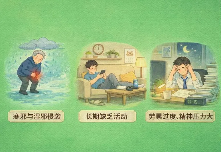 当正气不足、外邪侵袭,经络闭阻,就会出现疼痛、僵硬及活动不利等症状。