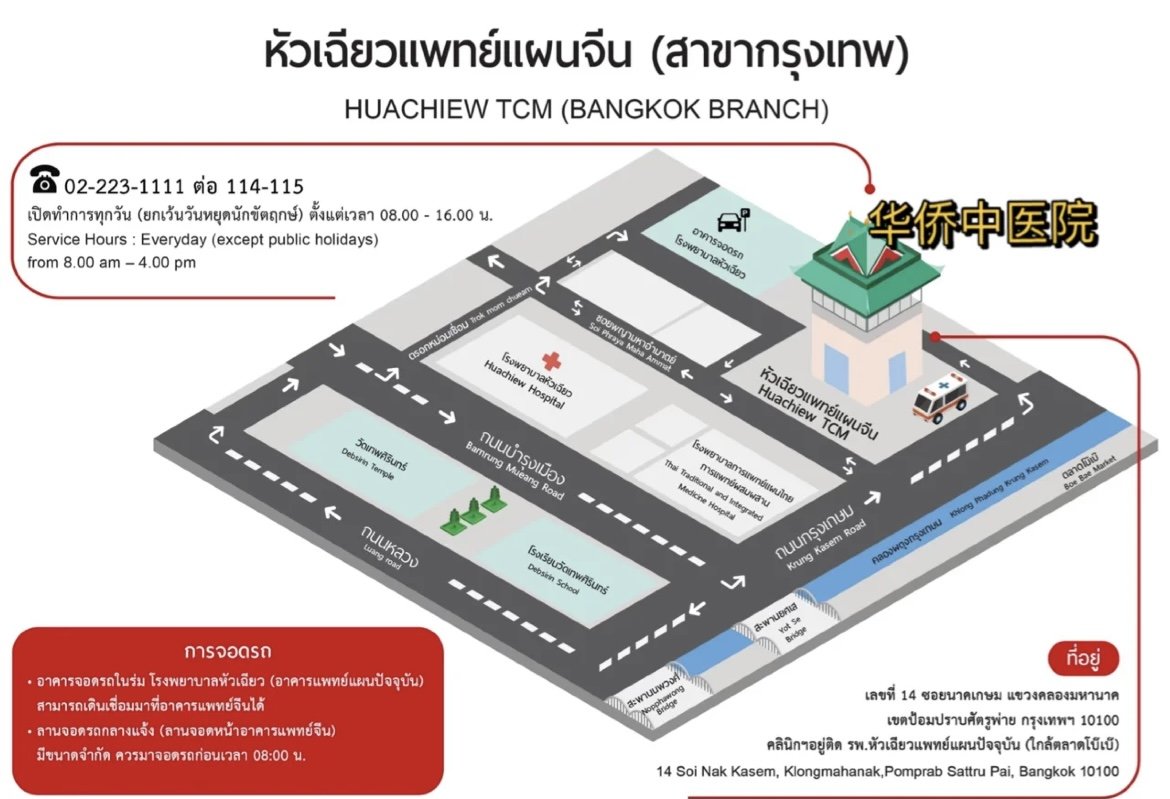 华侨中医院地址:14 Soi Nak Kasem , Klong Maha Nak ,Pom Prab Sattru Pai  曼谷  10100(邮编)          (Huachiew TCM)