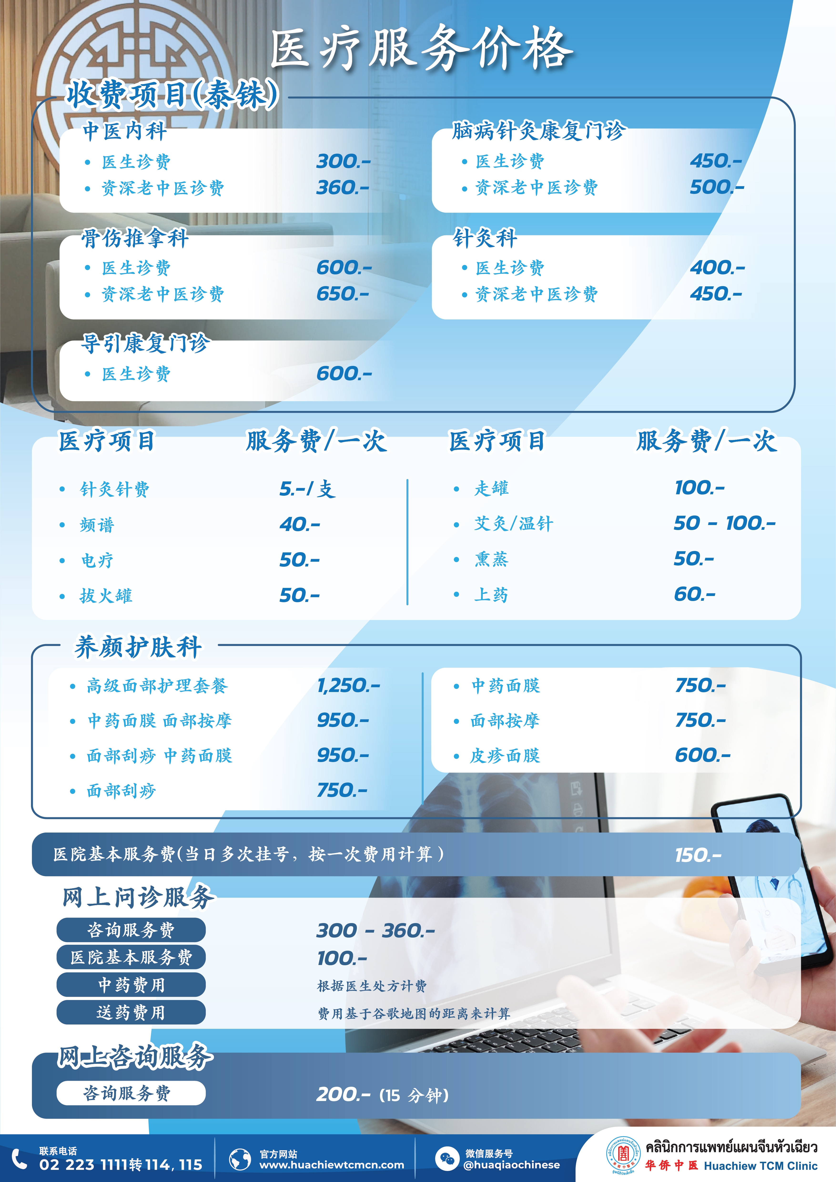 | 针灸科(医生诊费) | 400 | 资深老中医诊费450泰铢 |